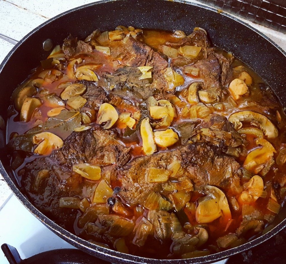 • Put slices of meat neatly in a saucepan and check where the liquids cover the meat. Make sure it covers at least 1 inch above the beef. Add cooking liquids until you are 1 inch above the beef.