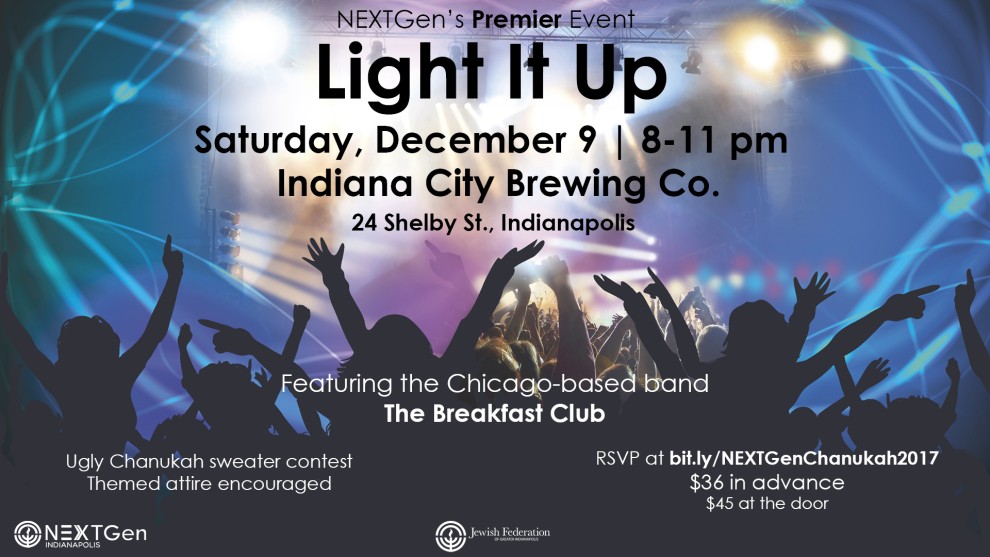 Please join NEXTGen and the Jewish Community for a night of dancing and Chanukah festivities as we celebrate our first successful year! Hosted at the The Indiana City Brewing Co, the night will feature live music from The Breakfast Club, Latke and Donut Bar, and much more.