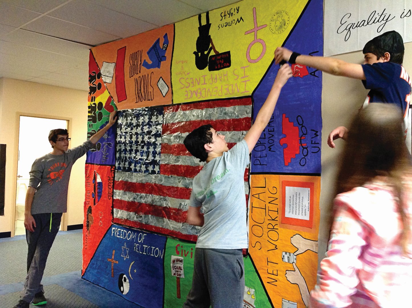 As responsible Americans, we must educate our youth in hopes of a better future. Students need to be educated on their rights, the sacrifices made to secure those right, and how to responsibly participate in civil society. The eighth grade created the centerpiece modeled after the flag made by Jasper Johns. The flag is made up of articles about civil rights from the 1950s. Around the flag are important rights, freedoms and movements that helped to secure those rights.