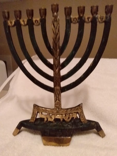 I am not sure when nor how my parents z"l acquired this chanukiah because I don't remember any Chanukahs without it. I know we had it in the 1950s. The fact that the Hebrew letters say Israel makes me believe it was made after 1948. Prior to this one, we had a silver one, also traditional shape, but this one was my favorite because it has a music box that played Rock of Ages. Each year as I use it, I picture it filled with straight, plain, orange candles, regardless of the fancy, colorful candles we use today. Our Family Chanukah Party is always at my house. There are 10 young people in my parents' great-grandchildren's generation, all of them were born while my parents z"l were still living. Through the years I have accumulated enough "traditional" menorahs for each of them to have one. I can only hope that each year as they light the candles, they will remember the Chanukah parties at my house just as I remember the drippy orange candles in my favorite chanukiah.