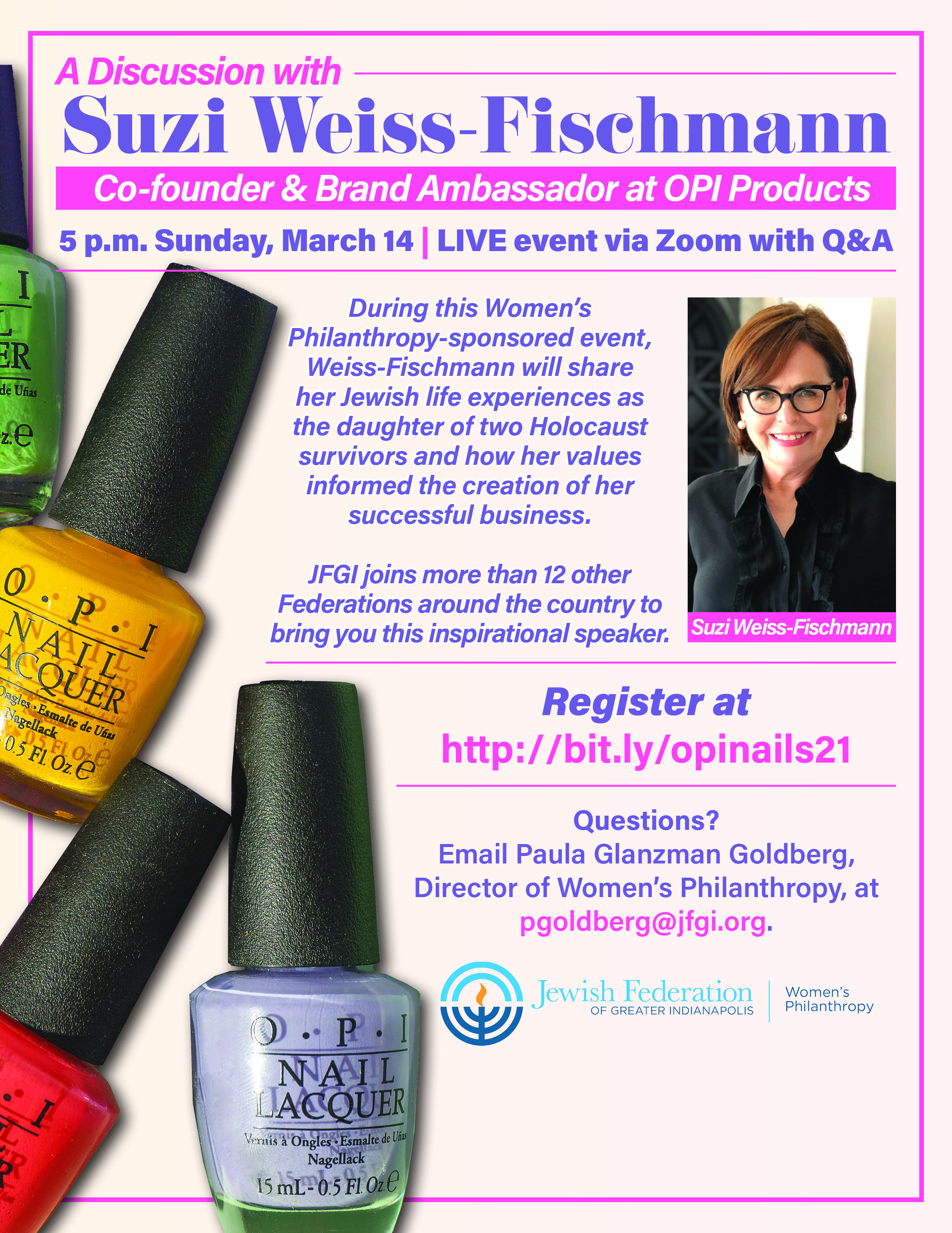 During this Women’s Philanthropy-sponsored event, Weiss-Fischmann will share her Jewish life experiences as the daughter of two Holocaust survivors and how her values informed the creation of her successful business.