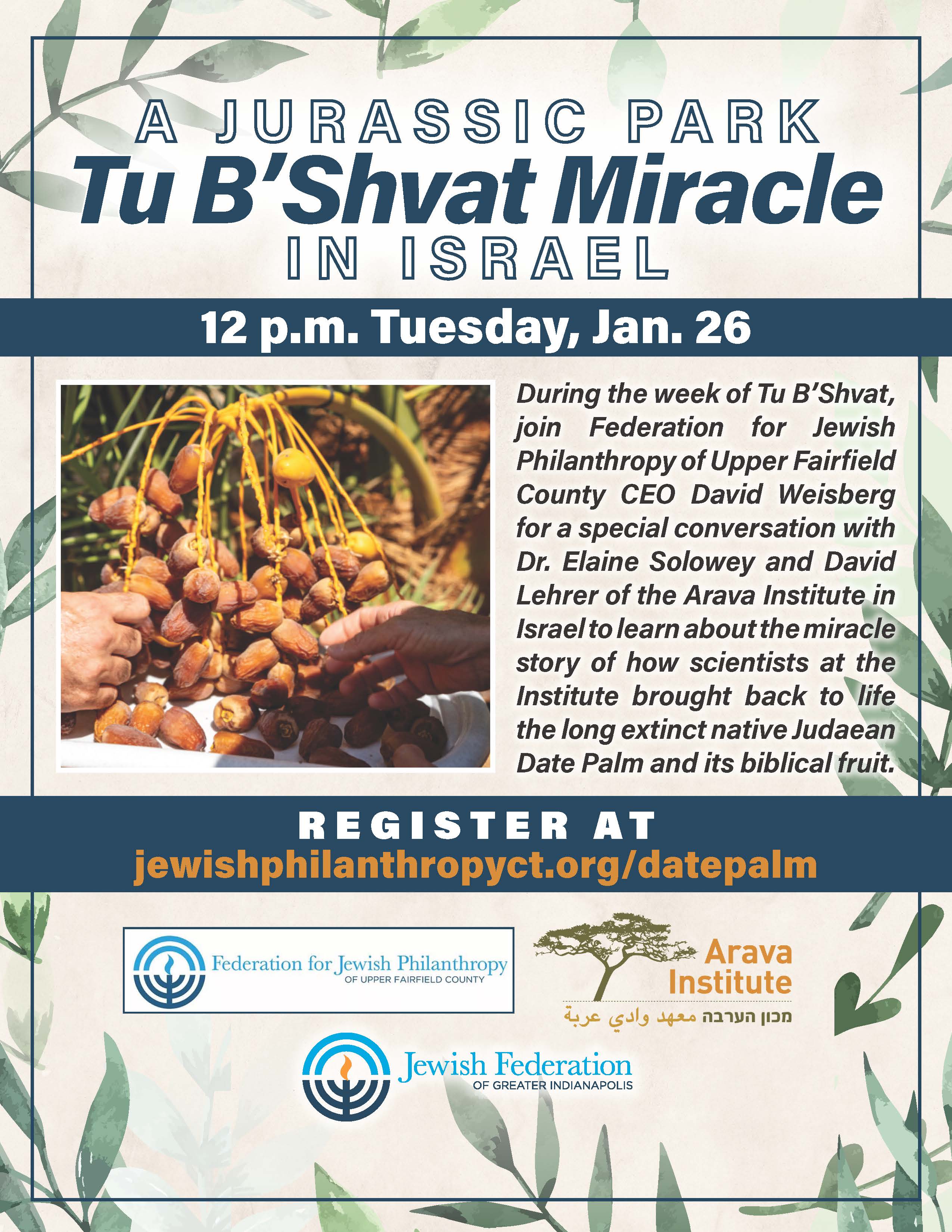 During the week of Tu B’Shevat, join Federation for Jewish Philanthropy of Upper Fairfield County CEO David Weisberg for a special conversation with Dr. Elaine Solowey and David Lehrer of the Arava Institute in Israel to learn about the miracle story of how scientists at the Institute brought back to life the long extinct native Judaean Date Palm and its biblical fruit.