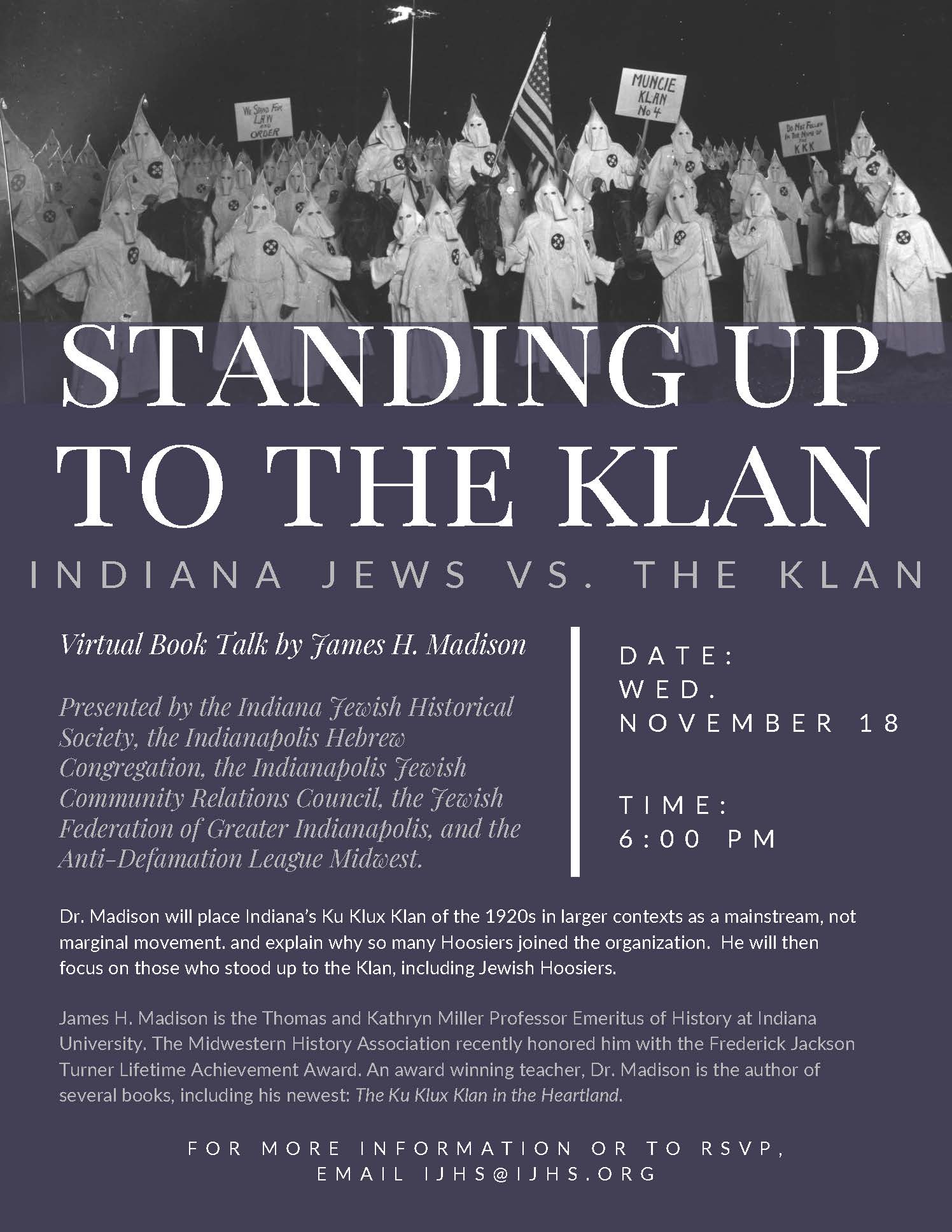 Dr. Madison will place Indiana’s Ku Klux Klan of the 1920s in larger contexts as a mainstream, not a marginal movement, and explain why so many Hoosiers joined the organization. He will then focus on those who stood up to the Klan, focusing on Jewish Hoosiers.